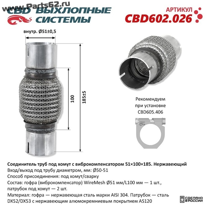 | Состав | гофра (виброкомпенсатор) WireMesh Ø51 мм/L100 мм - 1 шт, патрубок под хомут - 2 шт |