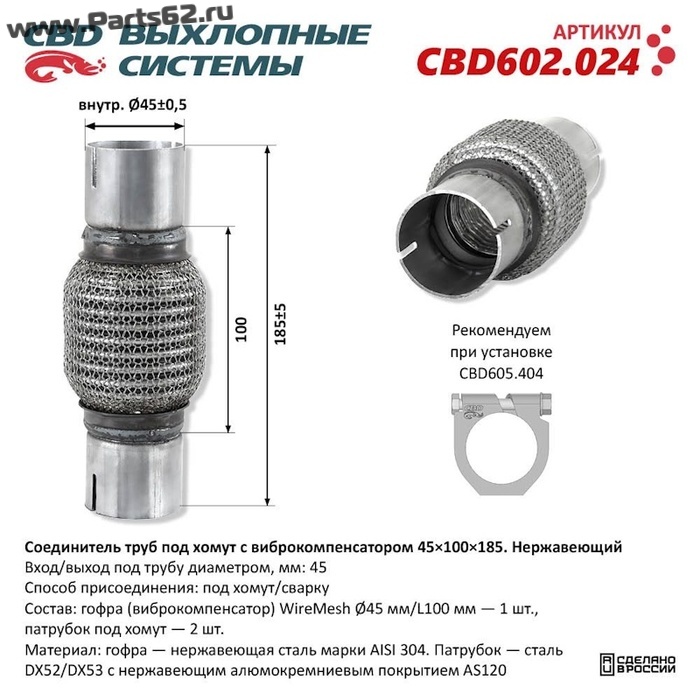 | Состав | гофра (виброкомпенсатор) WireMesh Ø45 мм/L100 мм - 1 шт, патрубок под хомут - 2 шт |