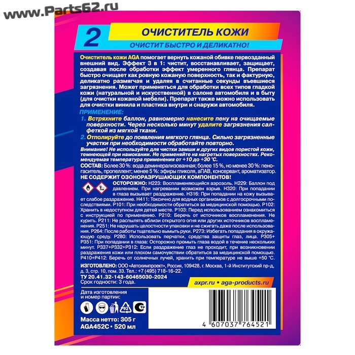 Помогает вернуть кожаной обивке первозданный внешний вид. Эффект 3 в 1: чистит, восстанавливает, защищает, создавая после обработки эффект умеренного глянца. Препарат быстро очищает как ровную кожаную поверхность, так и фактурную, деликатно размягчая и удаляя в считанные секунды въевшиеся загрязнения.