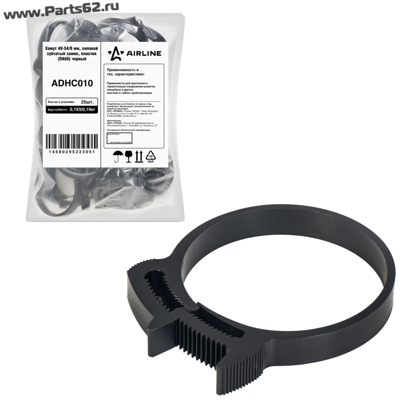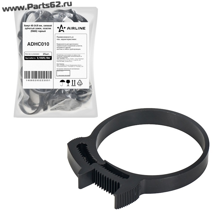 | Наименование | Хомут 49-54/9 мм, силовой зубчатый замок, пластик (ПА66) черный |