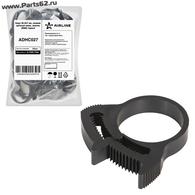 | Наименование | Хомут 20-24/7 мм, силовой зубчатый замок, пластик (ПА66) черный |