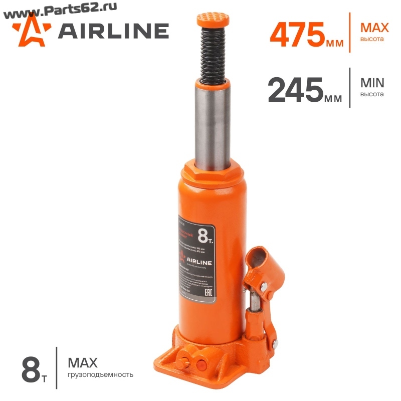 | Наименование | Домкрат бутылочный 8т PRO (MIN-245 мм, MAX-475 мм) |