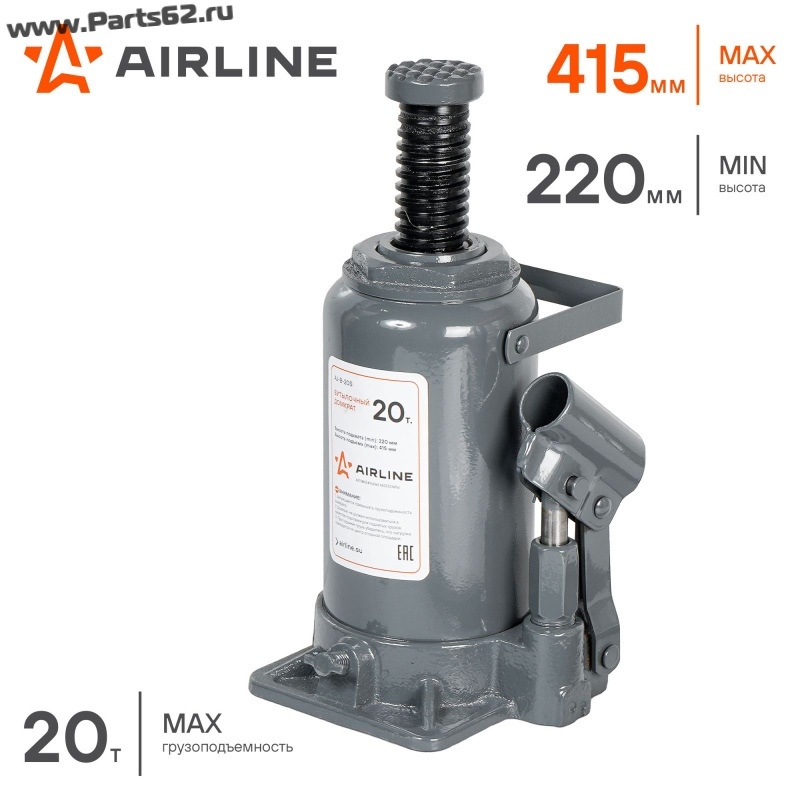 | Наименование | Домкрат бутылочный 20т (MIN - 220 мм, MAX - 415 мм) |