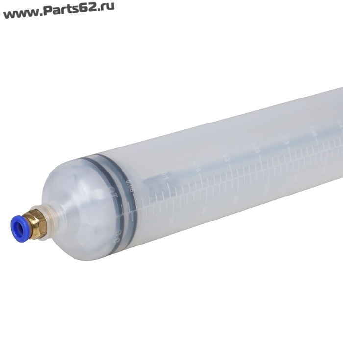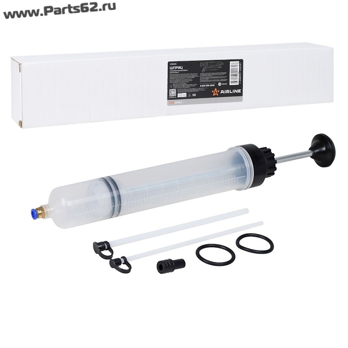 Шприц изготовлен из высокопрочного пластика. Поршень имеет двойное манжетное уплотнение обеспечивающее полную герметичность. Шприц комплектуется двумя дополнительными манжетами, шлангом 8х200мм, шлангом 6х200мм, а также резиновым адаптером для удлинения трубки.