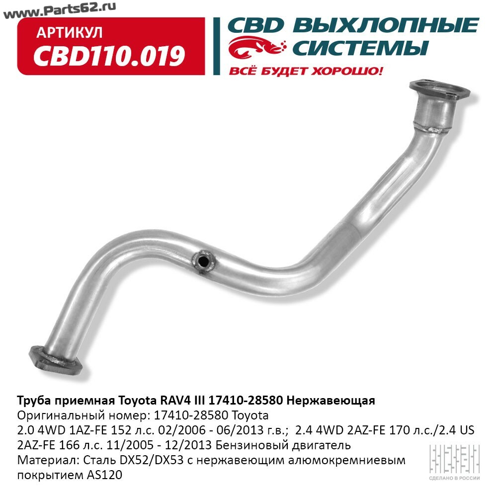 | Наименование | Труба приемная Toyota RAV4 III 17410-28580 Нержавеющая.CBD110.019 |