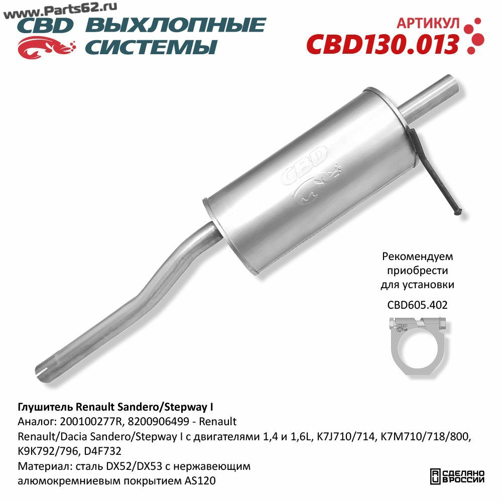 | Наименование | Глушитель Renault Sandero/Stepway I 200100277R 1,4/1,6L. Нержавеющий. CBD130.013 |