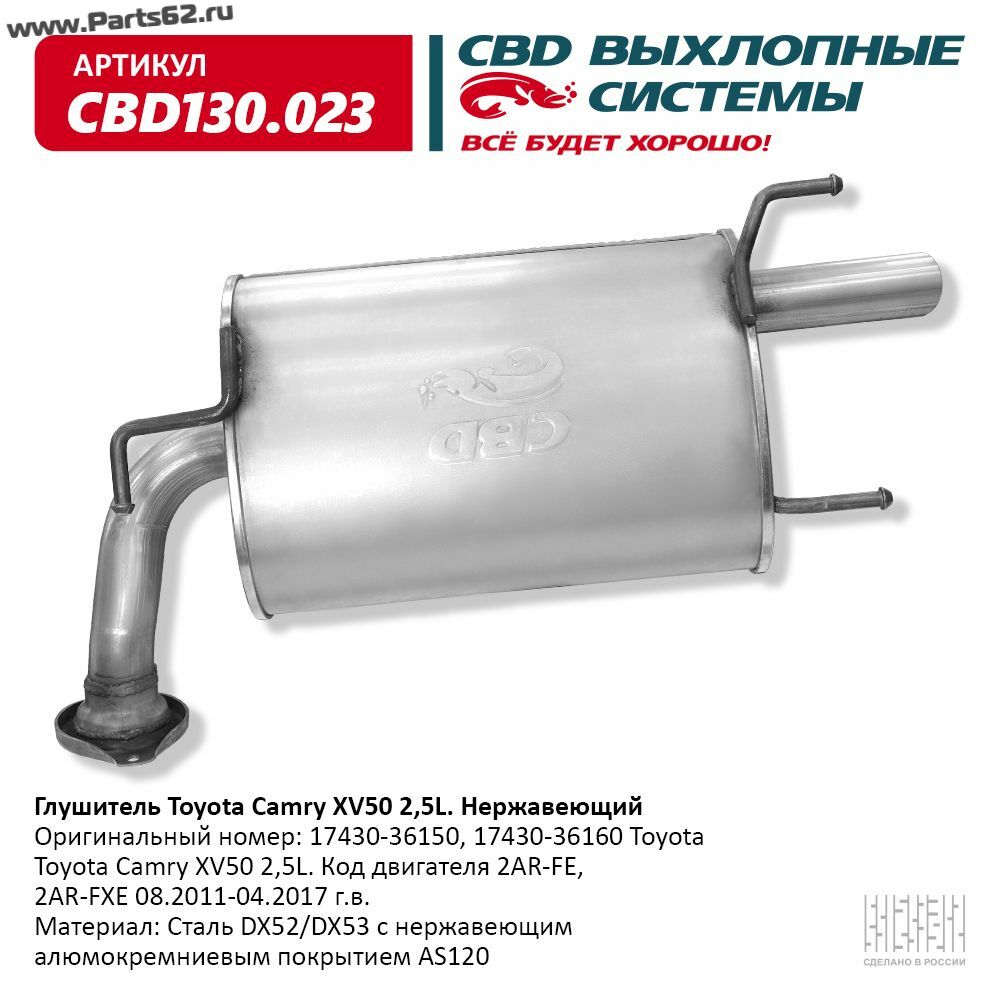 | Наименование | Глушитель Toyota Camry XV50 2,5L 17430-36150 Нержавеющий. CBD130.023 |