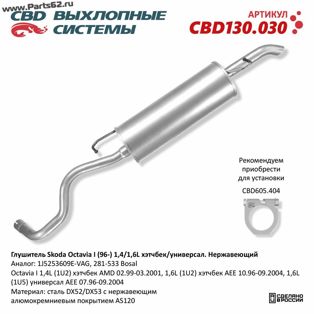 | Наименование | Глушитель Skoda Octavia I (96-) 1,4/1,6L 1J5253609E хэтчбек/универ. Нержавеющий. CBD130.030 |