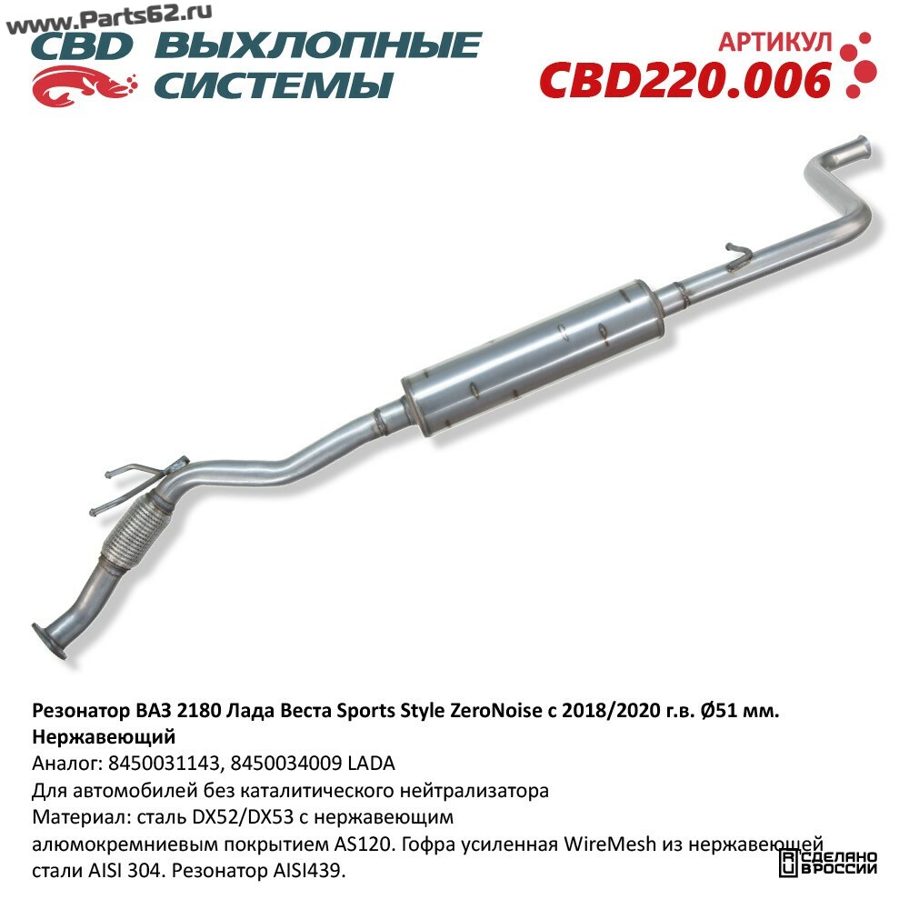 | Наименование | Резонатор ВАЗ 2180 Лада Веста Sports Style-ZeroNoise с 2018/2020 г.в. (труба O51мм). Нержавеющий. CBD220.006 |