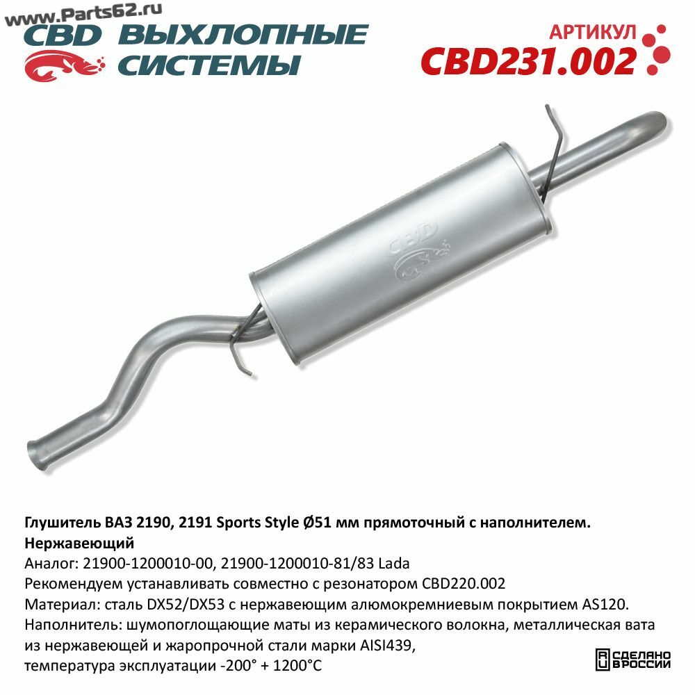 | Наименование | Глушитель ВАЗ 2190 Sports Style, прямоточный с наполнителем, труба Ø51мм. Нерж сталь. CBD231.002 NEW |