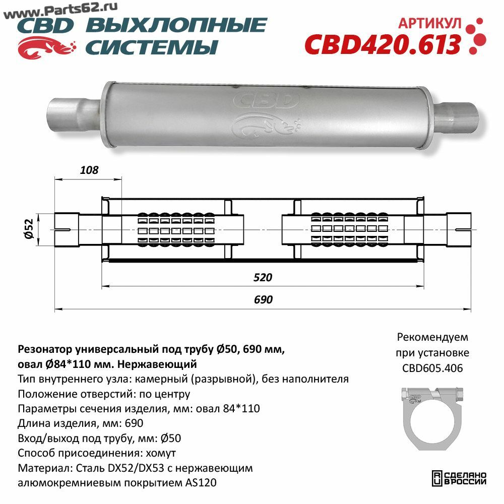 Наименование | Резонатор CBD-INDIANA L690, овал 84*110мм, под трубу 50мм. Нержавеющий. CBD420.613 |