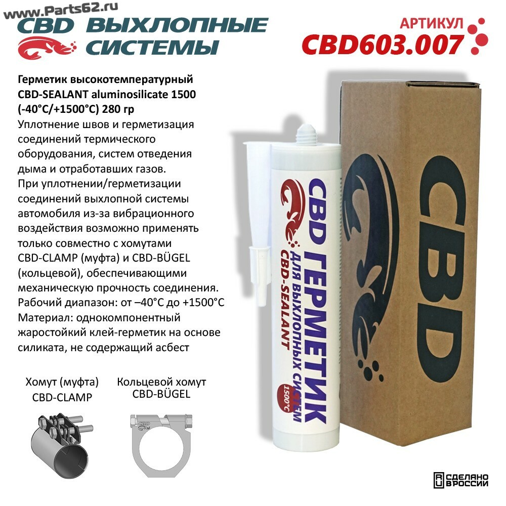 При уплотнении/герметизации соединений выхлопной системы автомобиля из-за вибрационного воздействия возможно применять только совместно с хомутами CBD‐CLAMP (муфта) и CBD‐BÜGEL (кольцевой), обеспечивающими механическую прочность соединения.