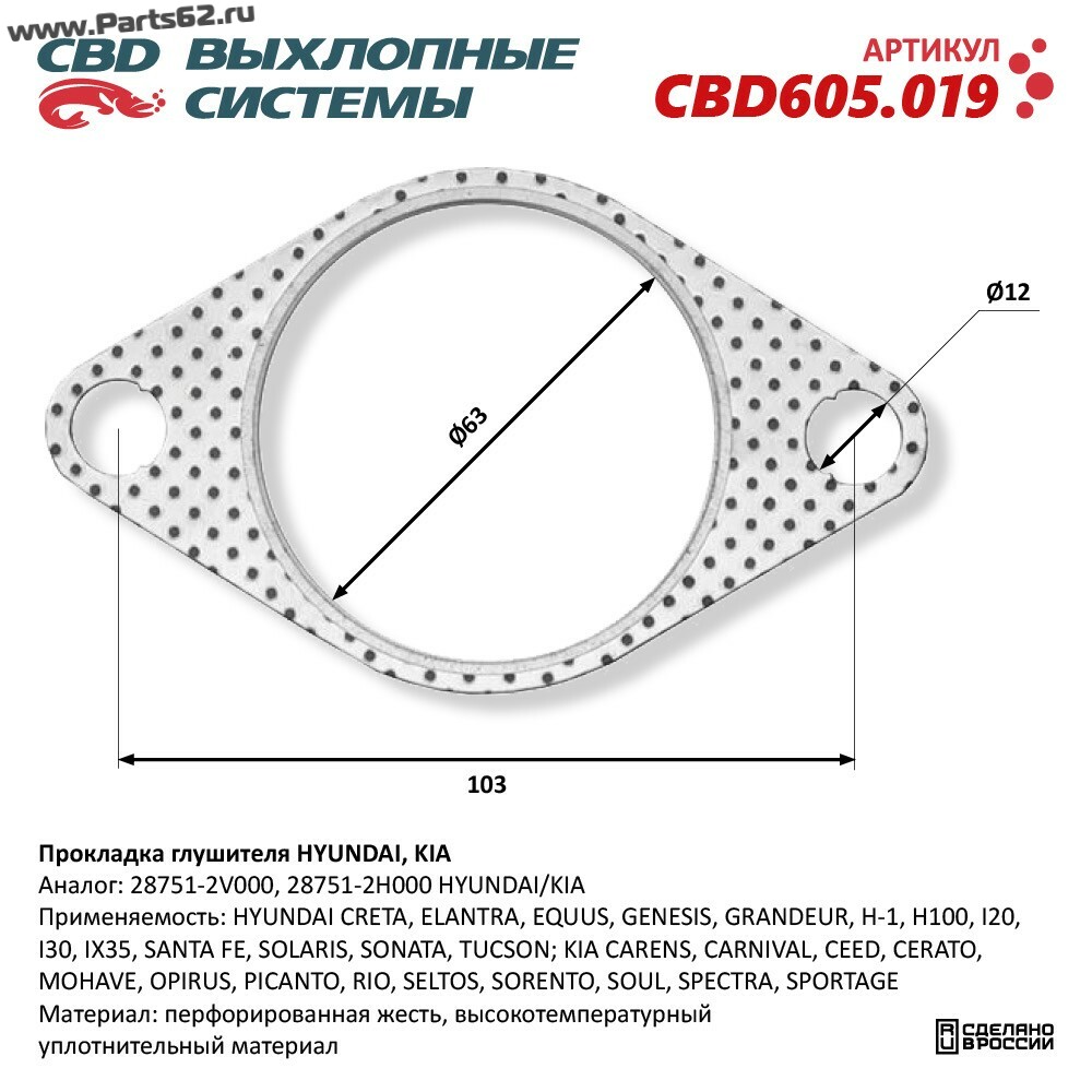 | Наименование | Прокладка глушителя HYUNDAI, KIA 28751-2V000. CBD605.019 |