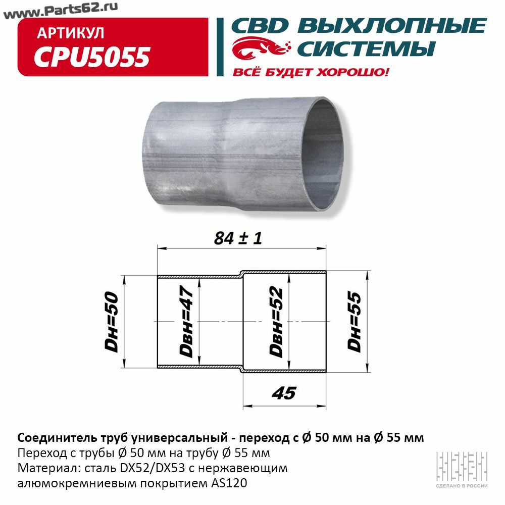 | Описание товара | Переход с трубы d 50 мм на трубу d 55 мм |