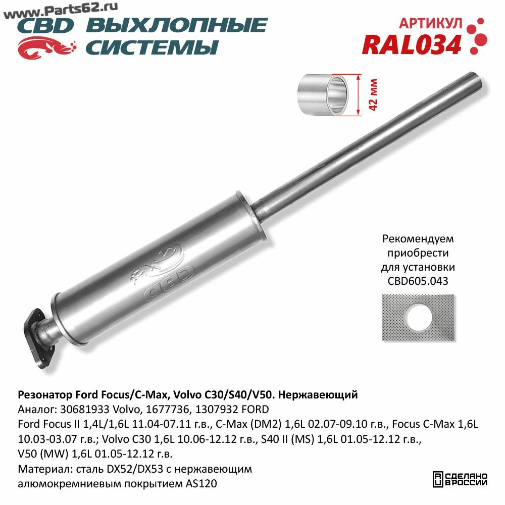 | Наименование | Резонатор Ford, Volvo-1677736, 1307932, 30681933 Нерж сталь. CBD. RAL034 |