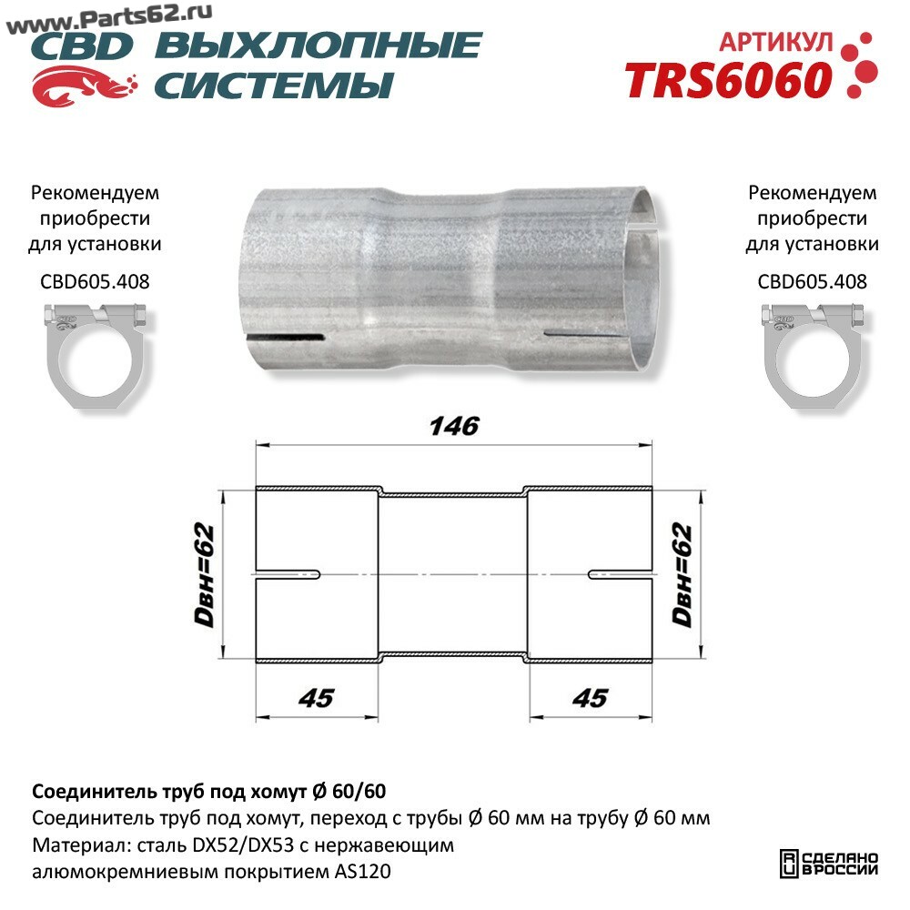 | Наименование | Соединитель труб под хомут 60/60 |