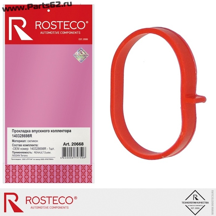 Прокладка впускного коллектора ROSTECO производится из силиконового компаунда ведущих мировых лидеров в отрасли компании, таких как WACKER, Momentive. Это обеспечивает превосходные характеристики, такие как исключительная герметичность узлов, повышенная устойчивость к агрессивной среде (нефтепродукты, щелочная среда), низкая адгезия, широкий диапазон рабочей температуры (-60°C .. +220°C).