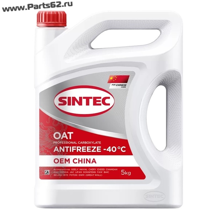 Sintec Antifreeze OEM China OAT red -40 – готовая к применению охлаждающая низкозамерзающая жидкость. Изготовлена из высококачественного моноэтиленгликоля и пакета присадок на основе карбоксилатной технологии OAT, специально адаптированной для применения в китайских автомобилях. Полностью соответствует и превосходит требованиям Chinese National Standard GB 29743, стандарт LEC-II. Не содержит нитритов, нитратов, аминов, фосфатов, боратов и силикатов.