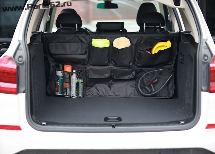 Автомобильный подвесной органайзер представляет собой полотно с карманами для хранения различных предметов и вещей. Например, детских игрушек, еды, книг, предметов первой необходимости, автомобильных принадлежностей. Изделие изготовлено из качественного и прочного износостойкого моющегося материала. Оно позволяет быстро и практично организовать пространство в багажнике любого автомобиля.