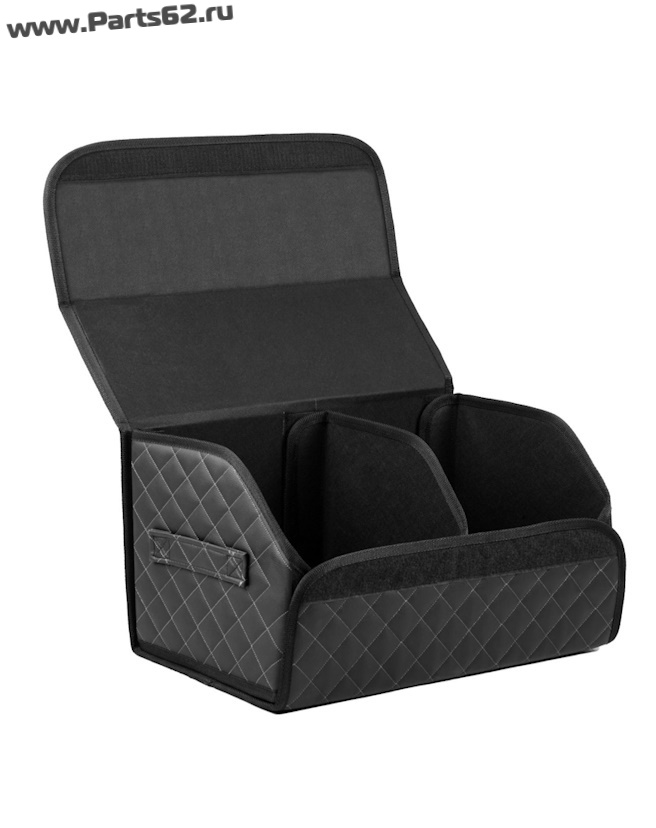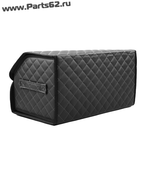 Органайзер предназначен для обеспечения порядка в багажнике автомобиля. Оснащён откидной крышкой и способен скрыть в себе 5 л. бутылки или канистры, а также все необходимые в дороге вещи. Органайзер изготовлен из высококачественной экокожи, простёганной в виде ромба, что придает ему элегантный, богатый вид. Внутри возможно установить перегородку для раздельного хранения вещей. По бокам расположены крепкие ручки для его переноски, а нижняя и задняя липучка надежно зафиксирует его к ворсовому покрытию багажника.