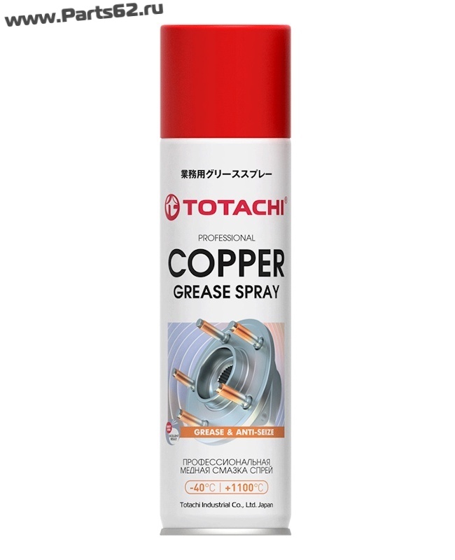 TOTACHI COPPER GREASE SPRAY – профессиональная смазка-спрей с высоким содержанием порошка меди. Предназначена для обработки резьбовых соединений, выхлопной и тормозной систем, болтов и шпилек ступиц колёс подвергающихся воздействию высоких температур и давлений. Обеспечивает лёгкую разборку прикипевших деталей. Защищает металлические поверхности (сталь и её сплавы, чугун, медь, латунь) от износа, окисления и прикипания в температурном диапазоне от –40°С до +1100°С. Устойчива к воздействиям кислот, солей, атмосферных влияний. Обеспечивает надёжную защиту от коррозии, заедания частей механизмов.